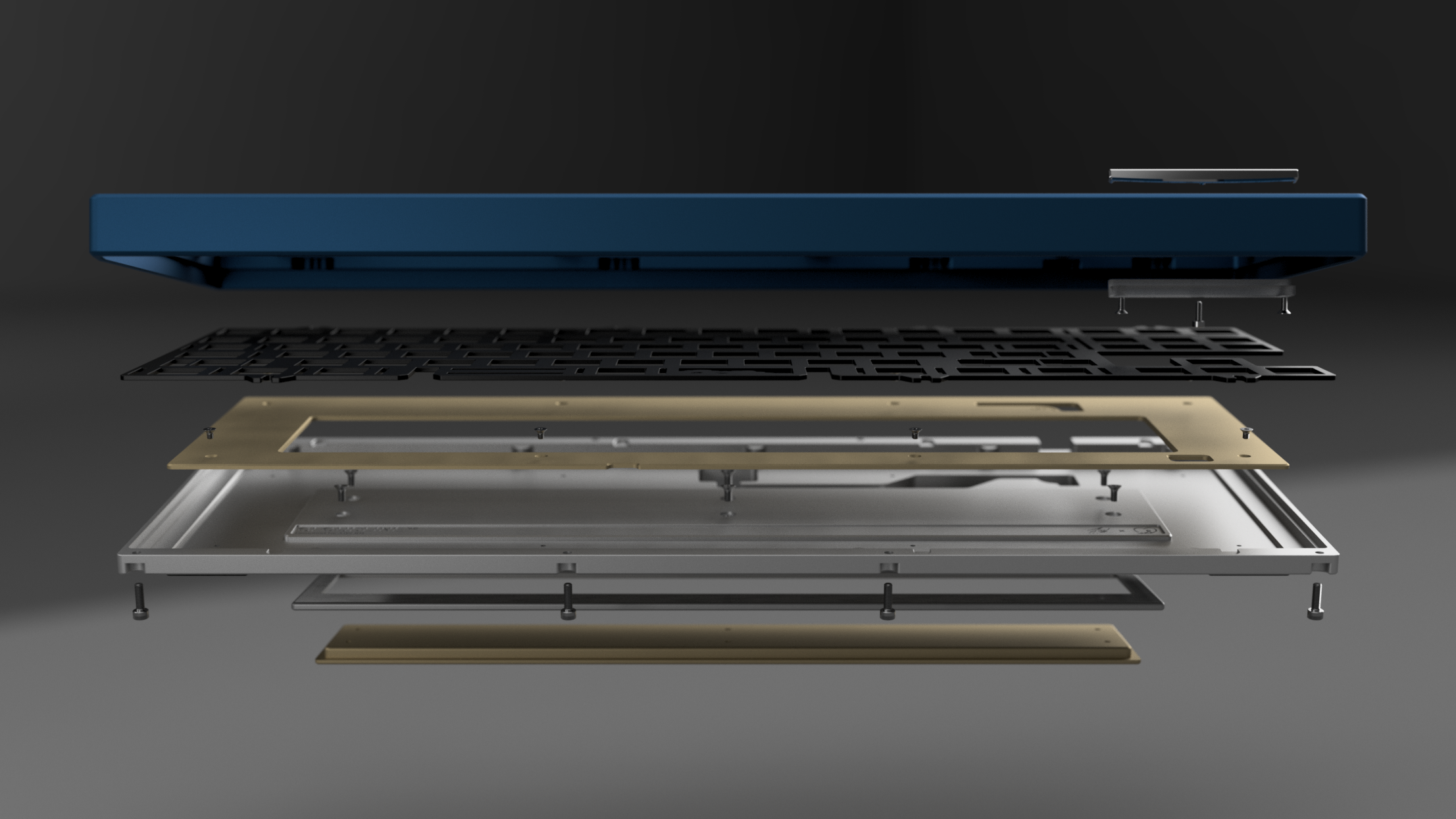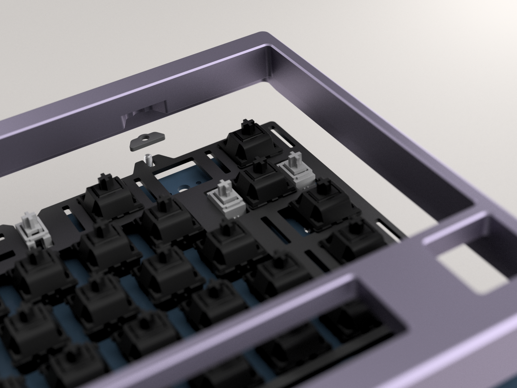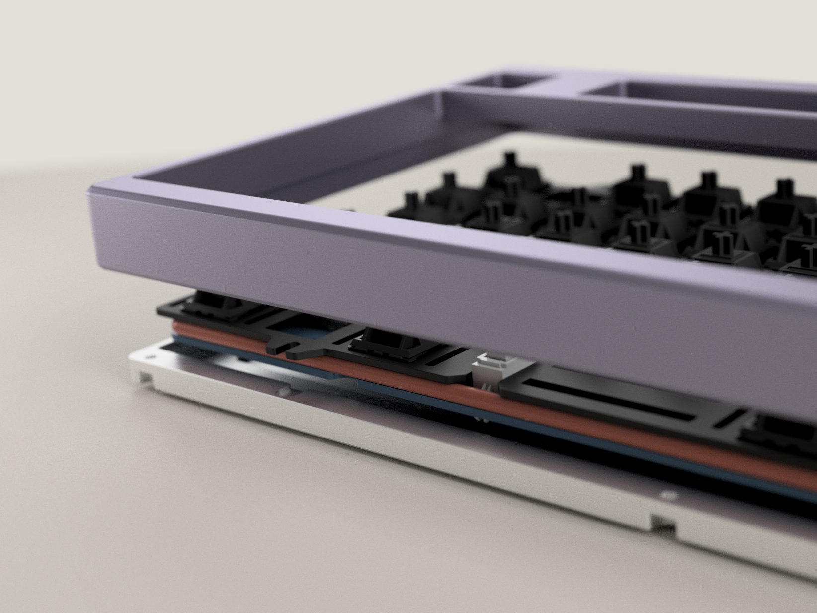 This mounting method is an implementation of the classic o-ring mount with a few key differences. The first thing to note is that we lean on a 'friction-fit', where the o-ring applies outward pressure on the side walls of the keyboard chassis. We also leave a ~1.0mm gap between the plate and the top case, ensuring there's no vertical pressure on the plate (and thus, no pressure on the top case - which often is the culprit for a 'boxy' and resonant sound). In addition, the o-ring is friction-fitted almost entirely into the top case while merely resting on the bottom case mounting posts, in hopes of providing as many contact points as possible to the o-ring.
