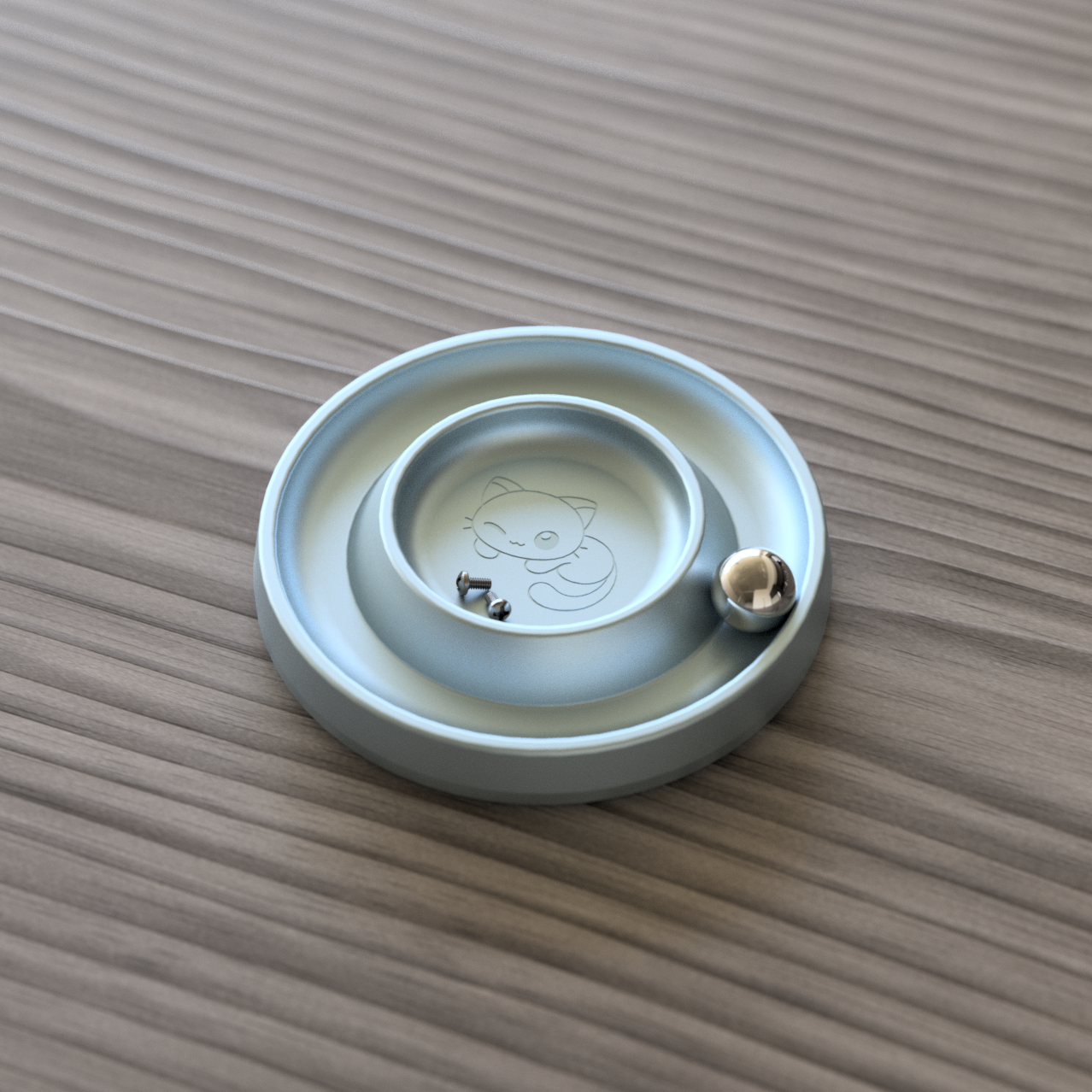 The tray features a magnetized central section where you can store various bits and bobs, as well as a curiously cute cat engraving by Shannie (@shannie.hoa). Of course, a 14mm steel bearing is included for those who want to use Play Tray as a mischievous fidgeting desk toy.