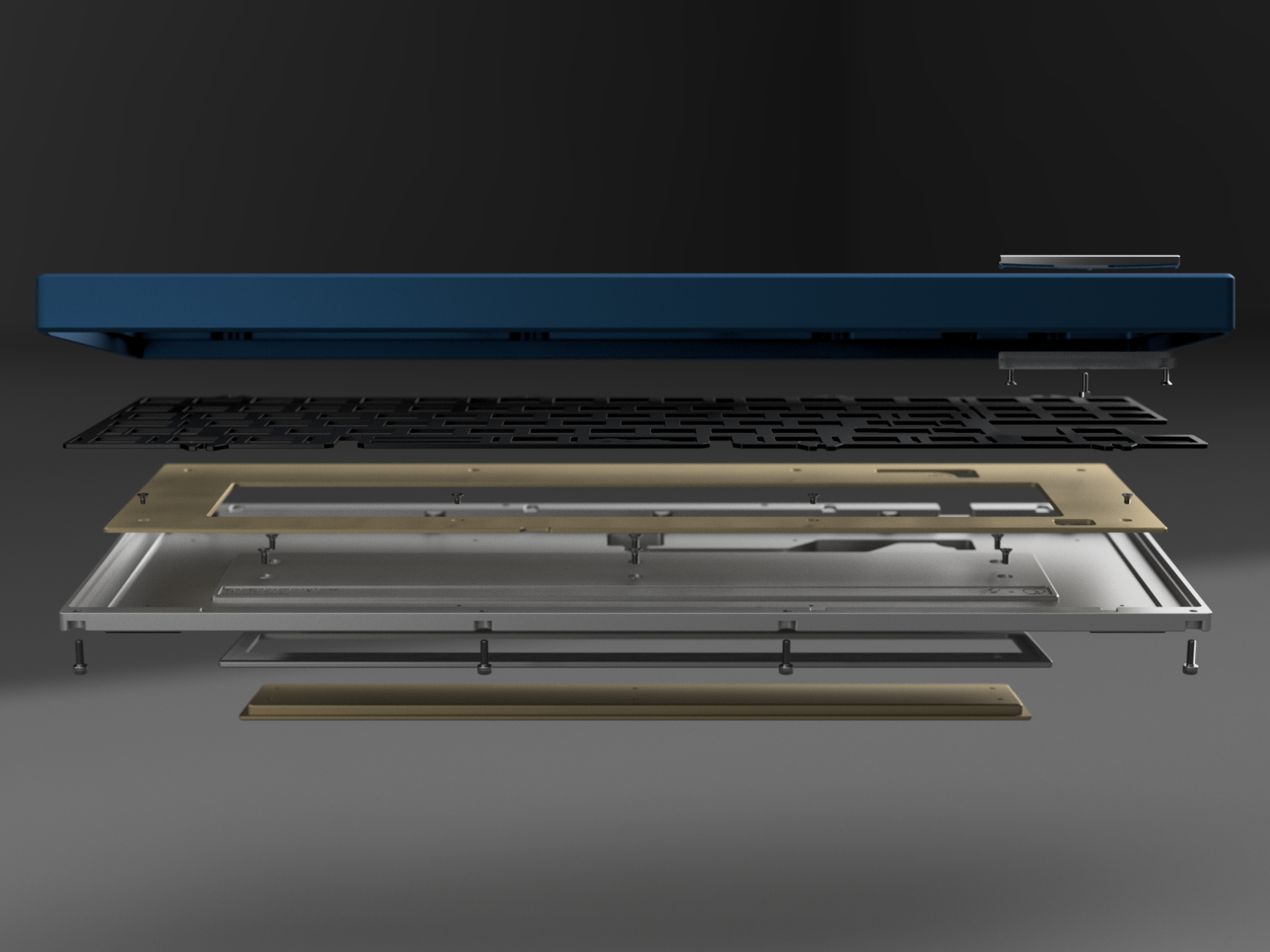 This mounting method is an implementation of the classic o-ring mount with a few key differences. The first thing to note is that we lean on a 'friction-fit', where the o-ring applies outward pressure on the side walls of the keyboard chassis. We also leave a ~1.0mm gap between the plate and the top case, ensuring there's no vertical pressure on the plate (and thus, no pressure on the top case - which often is the culprit for a 'boxy' and resonant sound). In addition, the o-ring is friction-fitted almost entirely into the top case while merely resting on the bottom case mounting posts, in hopes of providing as many contact points as possible to the o-ring.